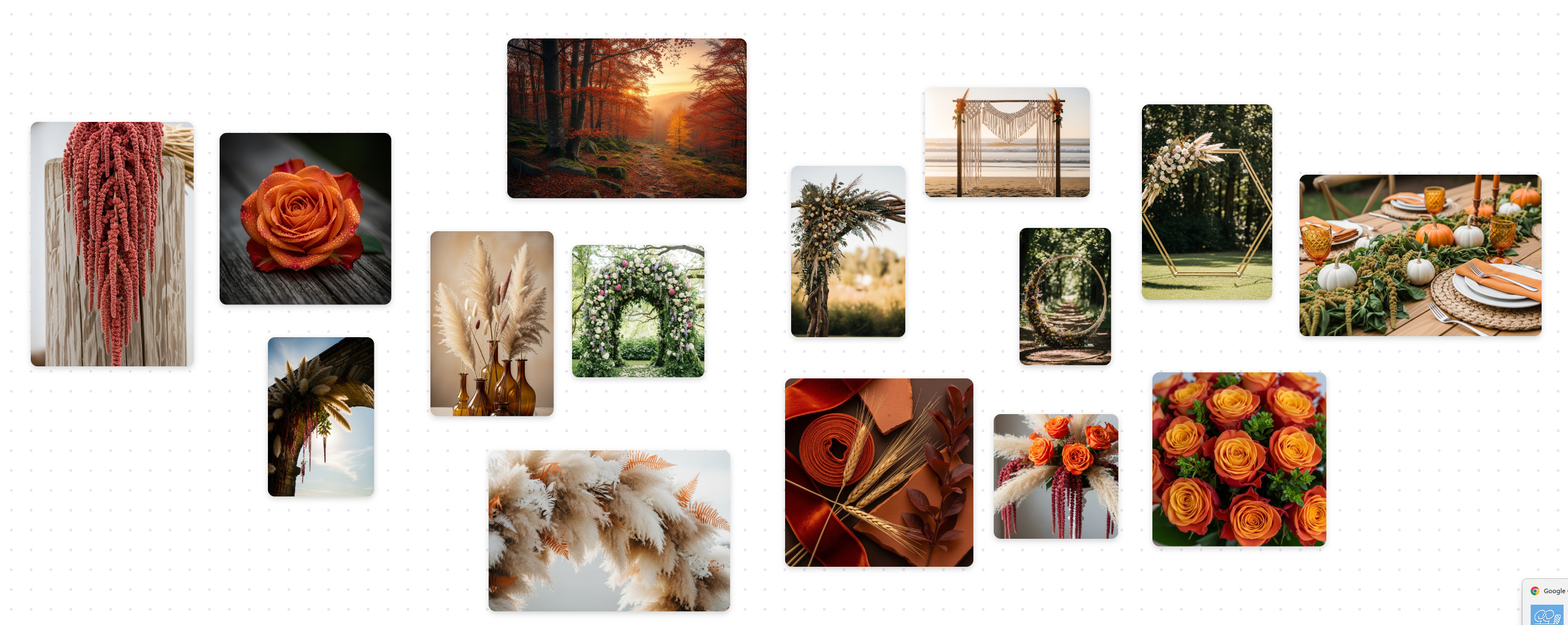 Try: "Autumn wedding arch with burnt orange roses, dried pampas grass, and trailing amaranthus"