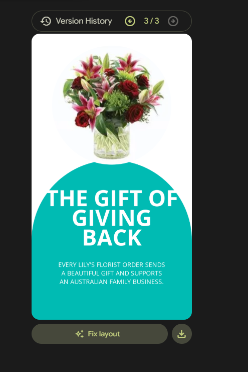 Click on the image you would like to edit. That image will pop up with numerous options. From here you can change the image, change the title of the Instagram post for you flower shop, you can change the description, you can download the image. Any changes you make are close to instant. You can also click the 'Fix layout button'. When clicked it will generally make a similar image with some small differences. You can create as many different ones as you like, above the image you will see some arrow buttons to toggle between your versions which is awesome.