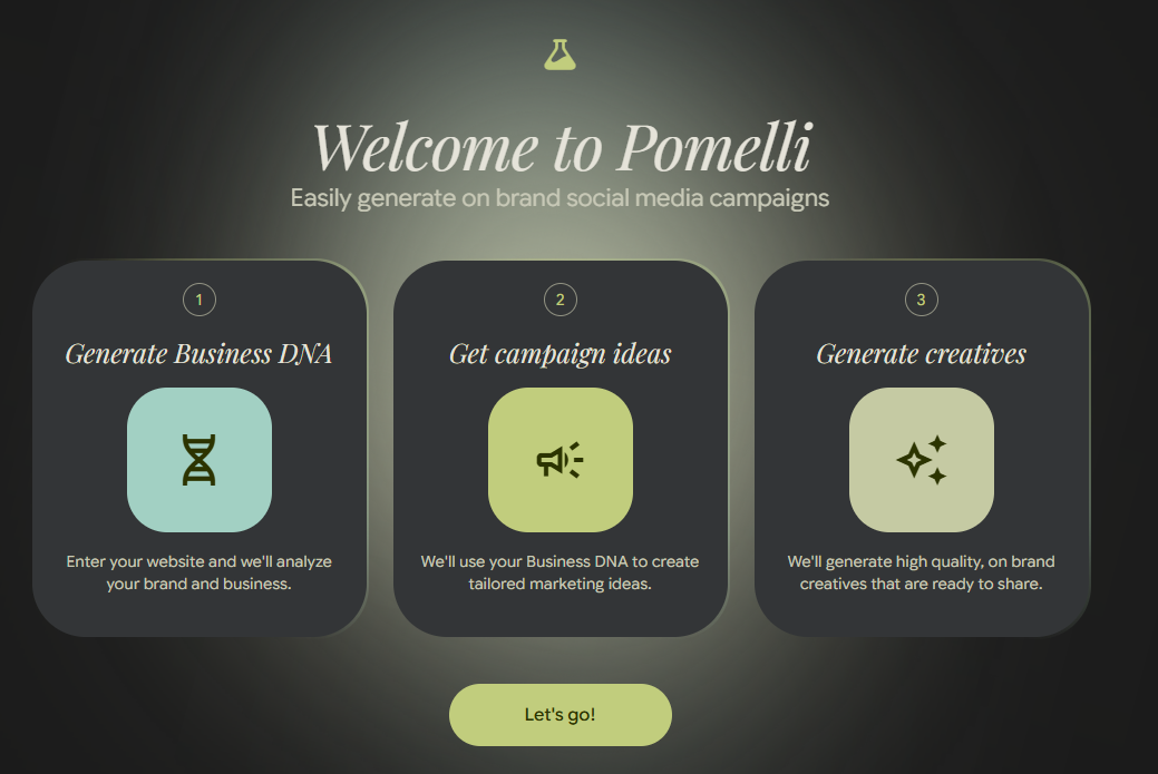 Right, first things first. You go to the Pomelli website (labs.google.com/pomelli). Once there, you will be presented with 3 things that Pomelli will do once you hit the "Let's go!" button: